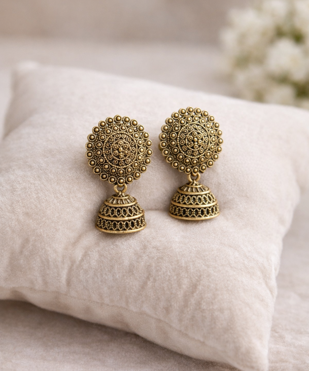 Add a touch of timeless tradition to your jewelry collection with these Antique Gold Oxidised Jhumka Earrings, specially crafted for women and girls who love classic ethnic and traditional styles. Inspired by traditional Indian craftsmanship, these earrings feature a beautifully detailed round stud with intricate patterns and a graceful oxidised jhumka drop that gives a rich, royal look.