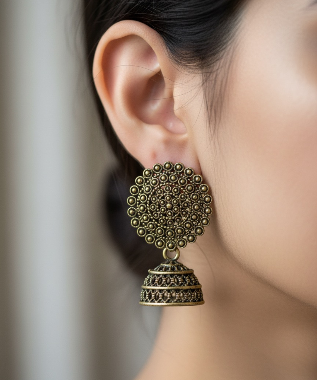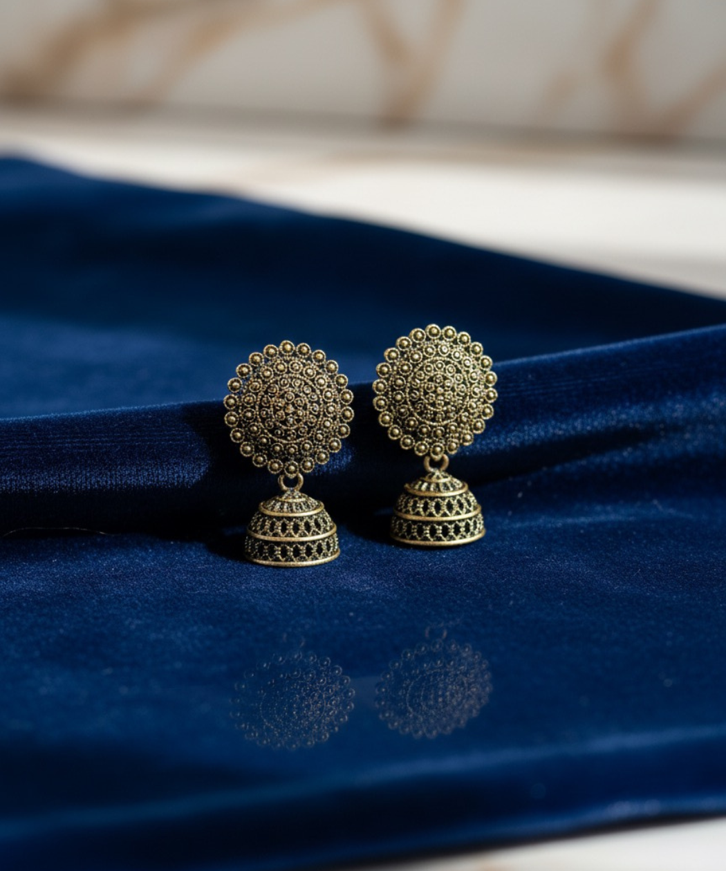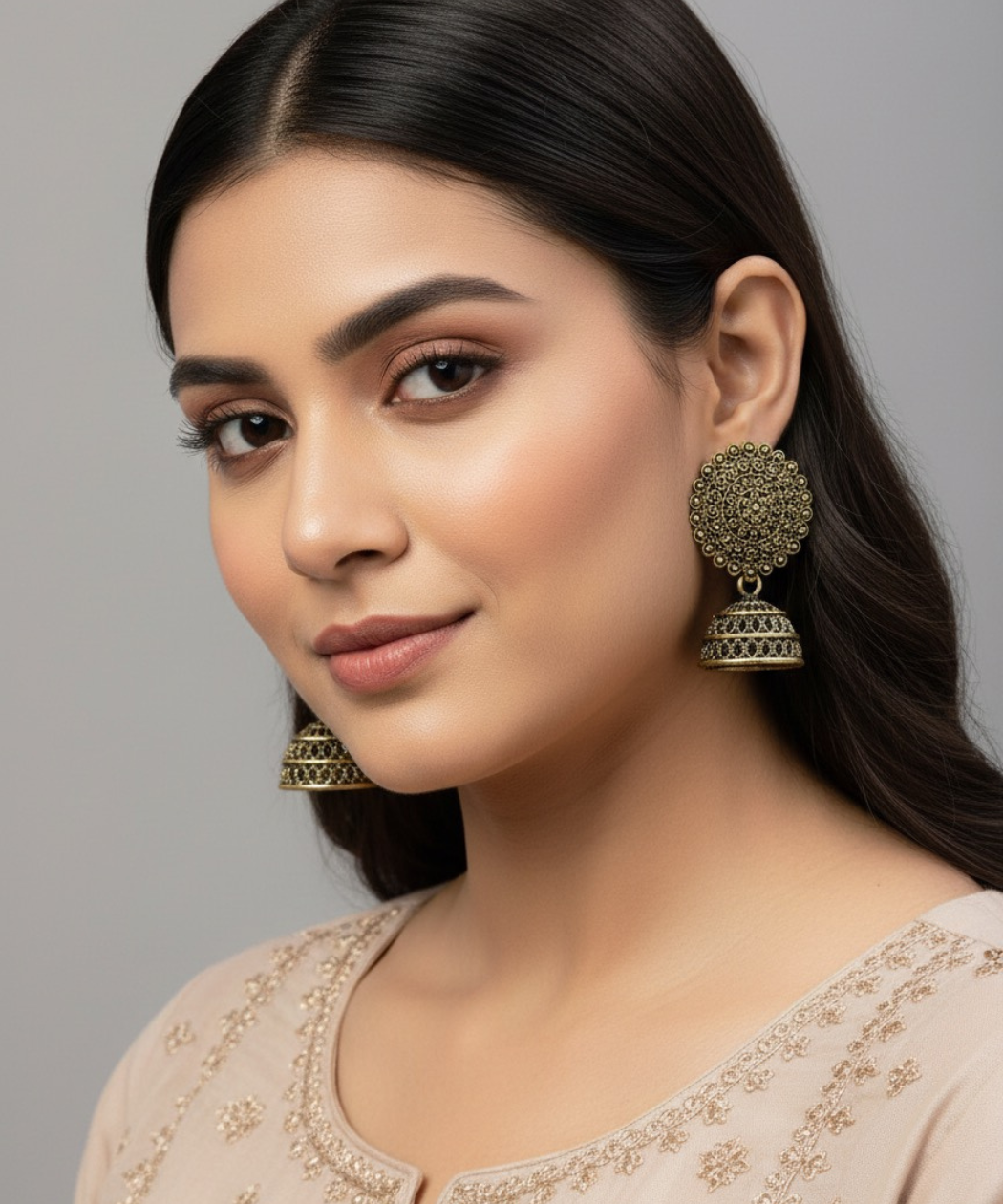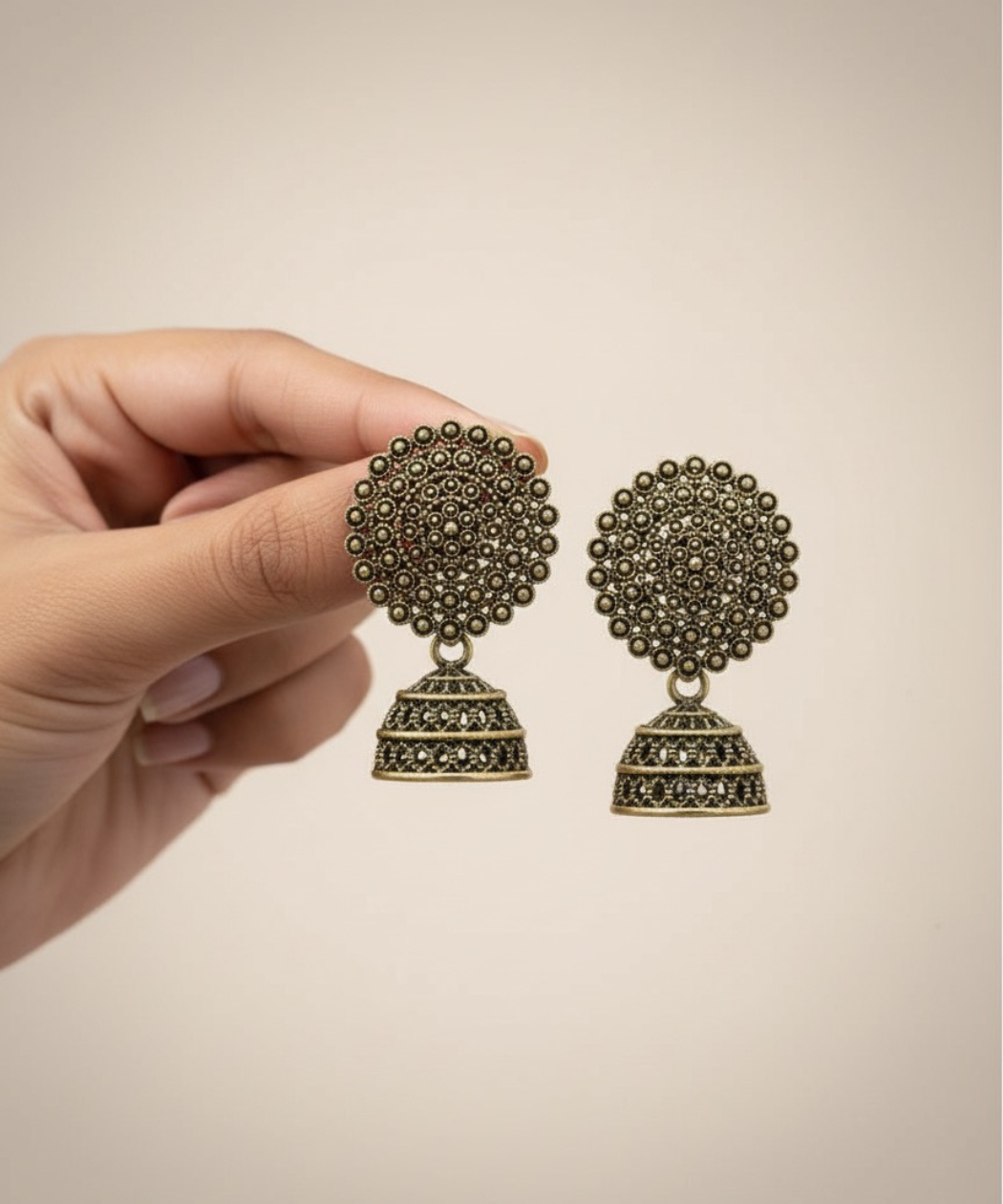 Finished in a premium antique gold oxidised tone, these earrings showcase detailed craftsmanship that enhances their vintage appeal. The elegant dome-shaped jhumka design adds depth and movement, making them a perfect statement piece for ethnic wear lovers.