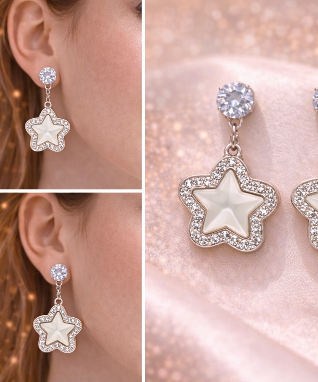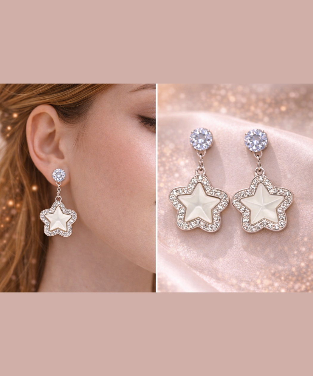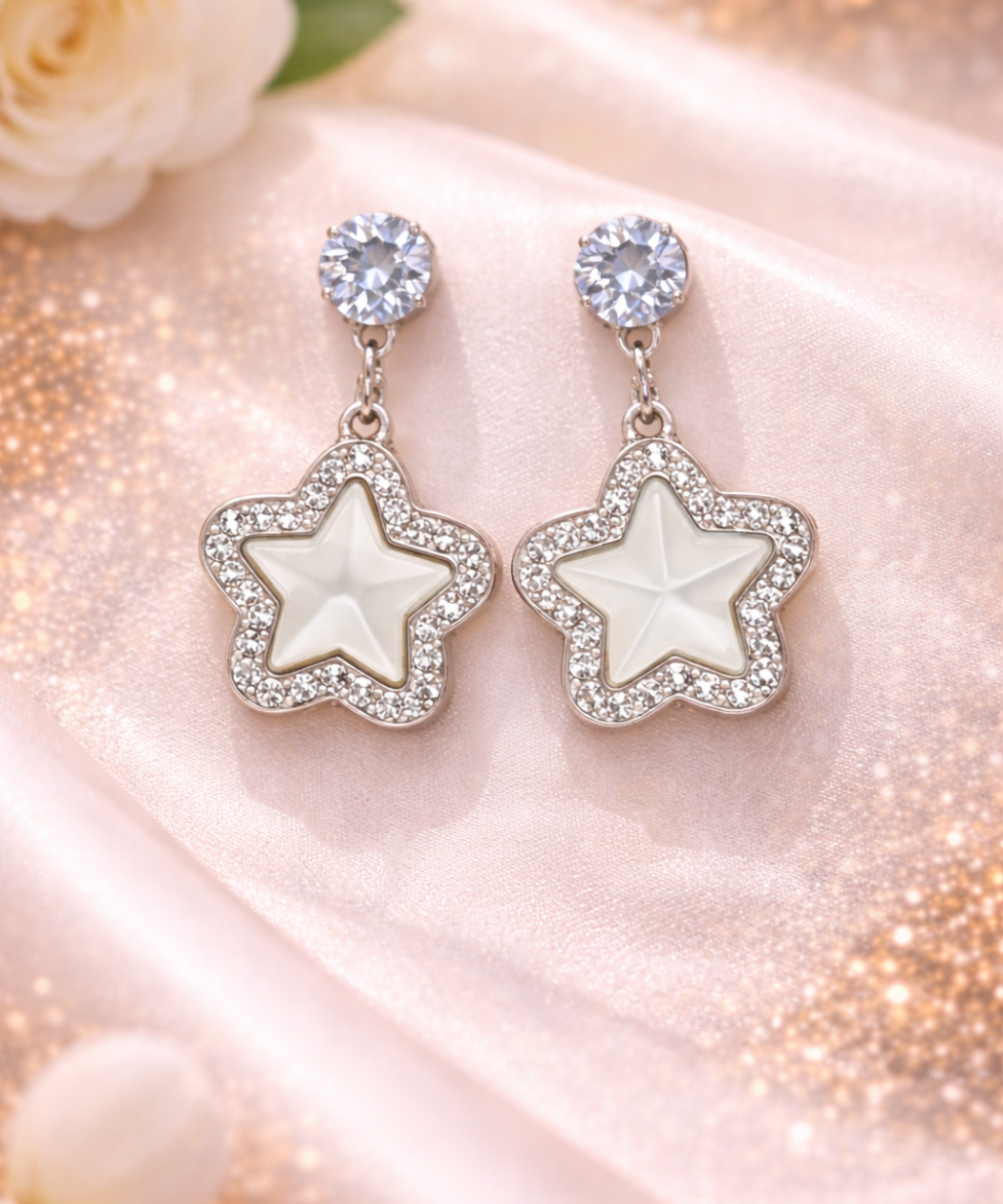 Crafted with a delicate star-shaped pearl centerpiece, surrounded by shimmering crystal accents, these drop earrings reflect light beautifully, enhancing your natural glow. The polished finish and refined detailing make them an ideal choice for women and girls who love subtle yet eye-catching jewelry.